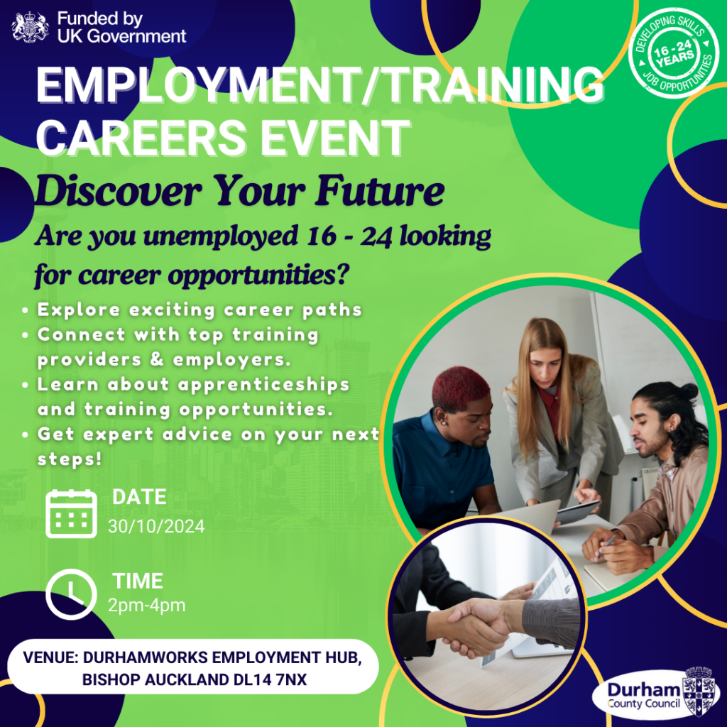 The event takes place between 2.00pm to 4.00pm on Wednesday 30 October 2024 at DurhamWorks Employment Hub, Bishop Auckland, DL14 7NX.